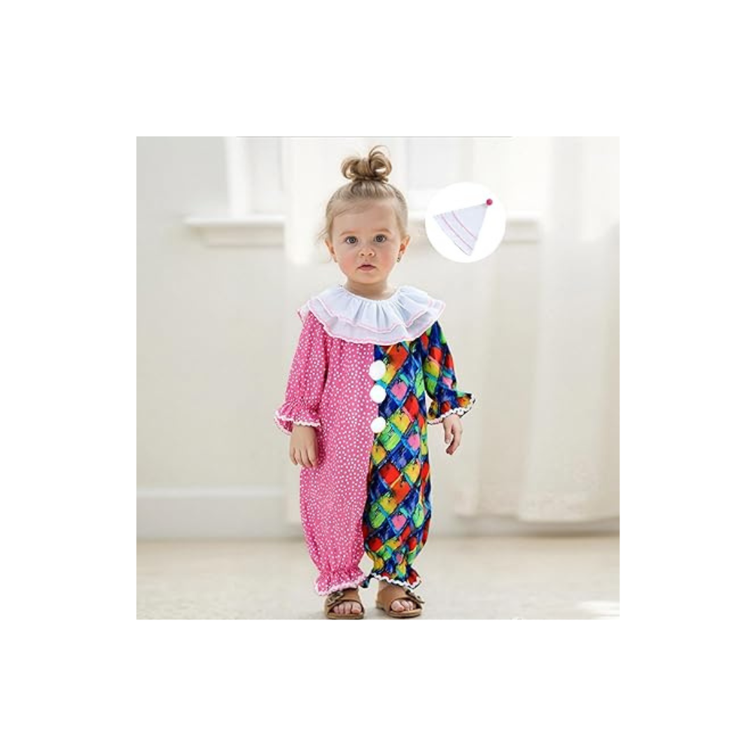 Convierte a tu pequeño en el centro de atención con este adorable disfraz de payaso. Diseñado tanto para bebés niño como niña, este traje es cómodo, colorido y perfecto para celebraciones de Halloween, fiestas temáticas, sesiones de fotos o juegos de disfraces.
