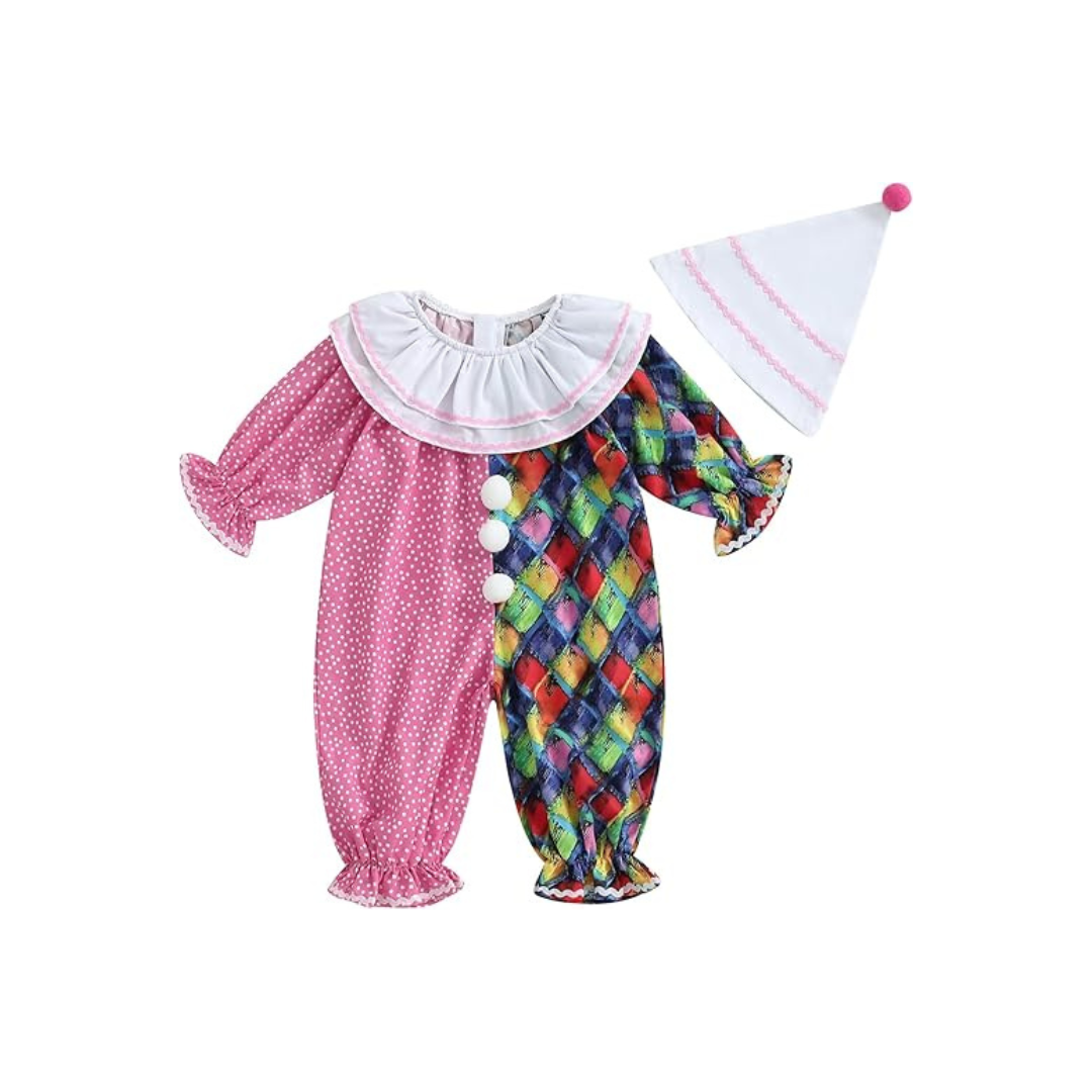 Traje completo: Incluye mono de manga larga en colores contrastantes y un simpático sombrero de payaso.