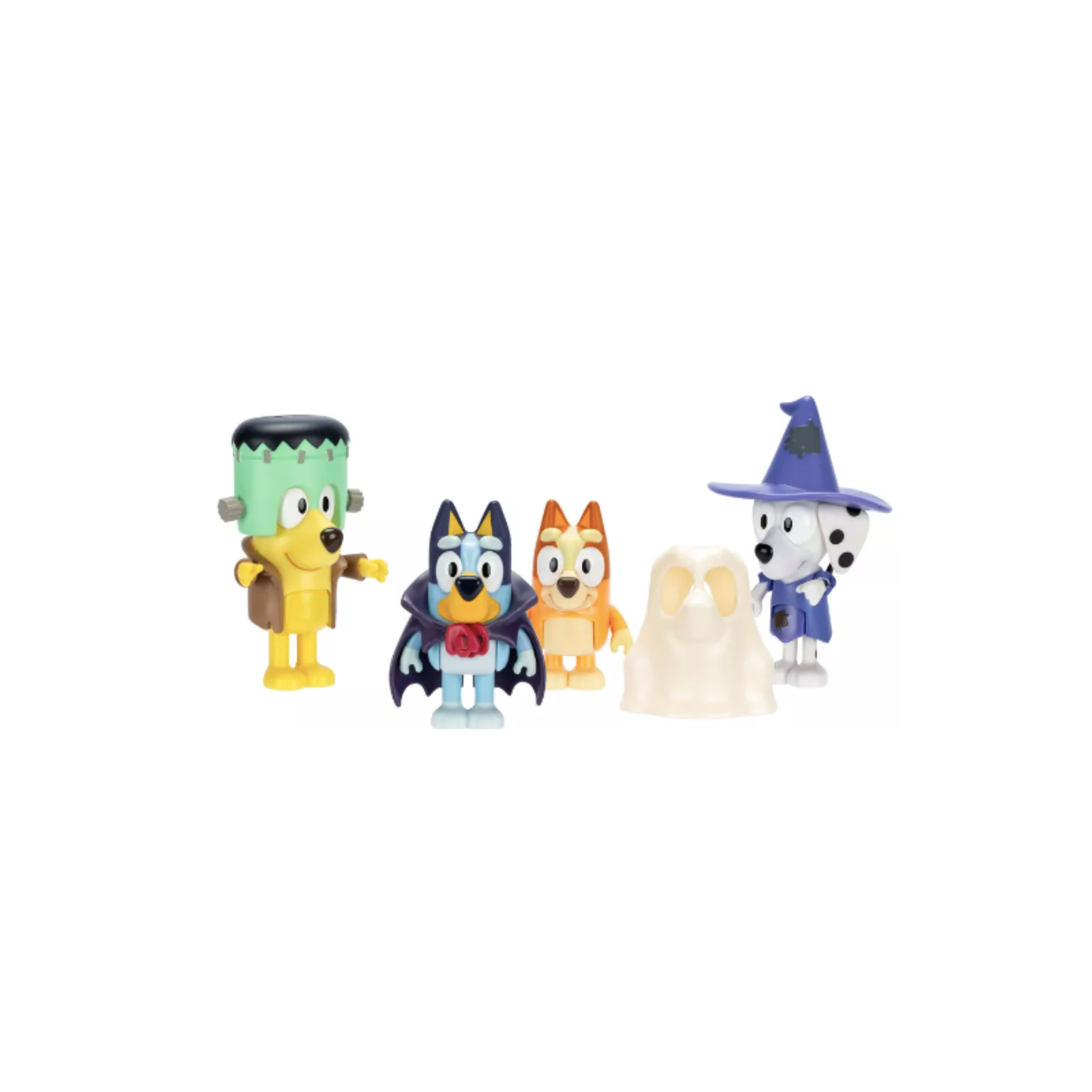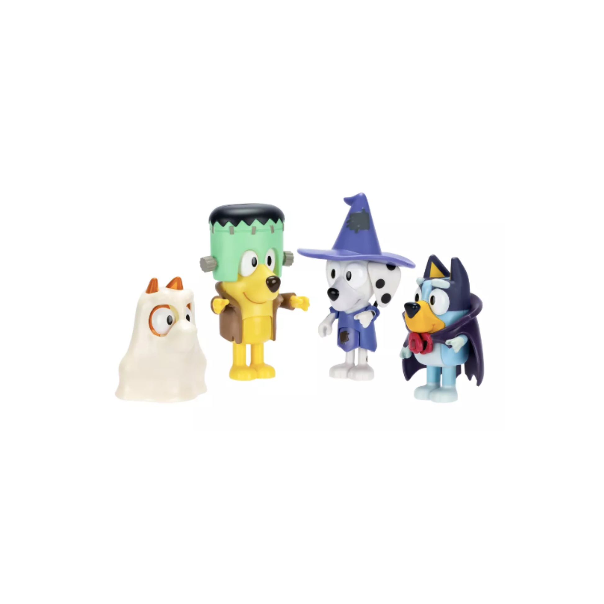Incluye: Bluey, Bingo, Chloe y Lucky con adorables trajes de fiesta (bruja, fantasma, vampiro y Frankenstein).