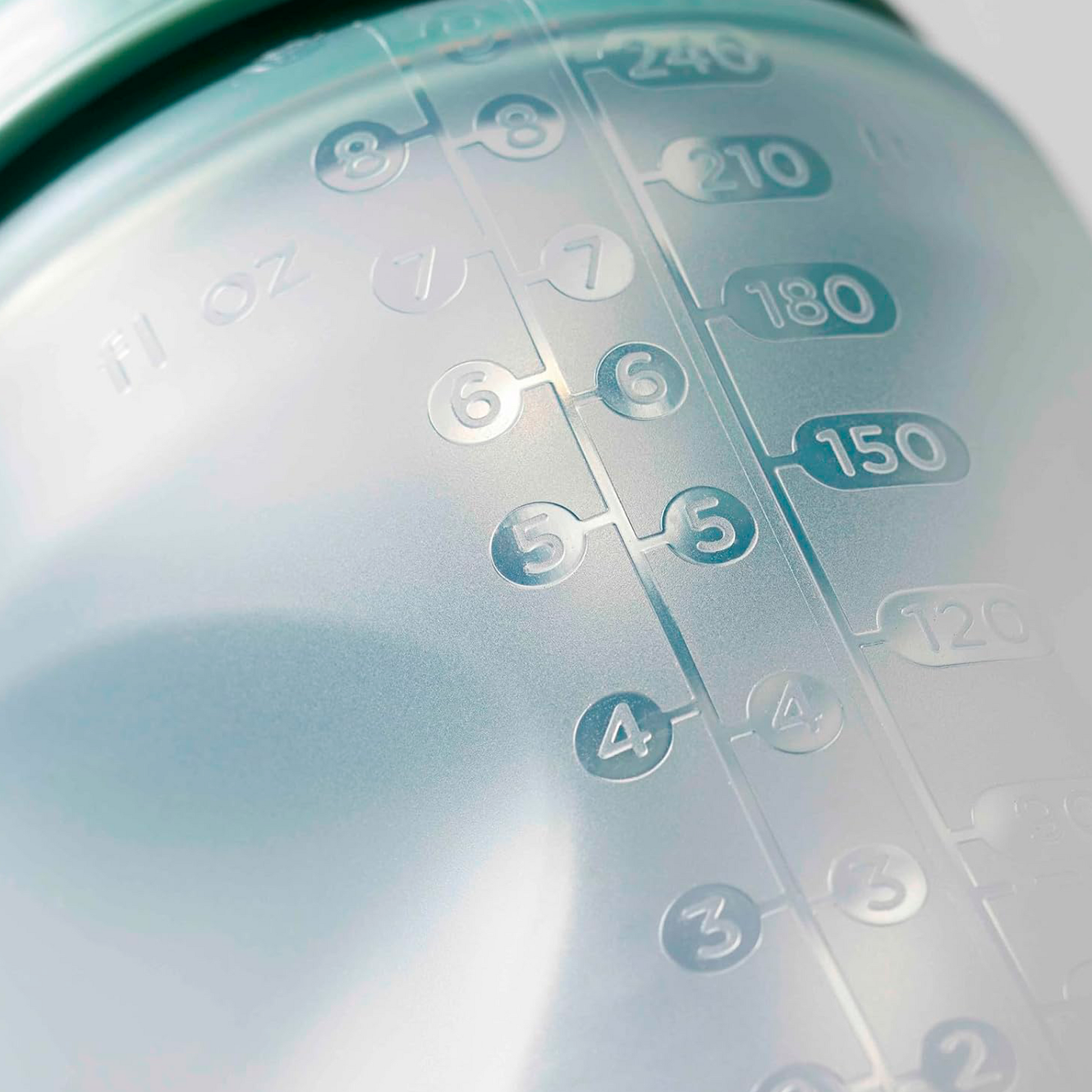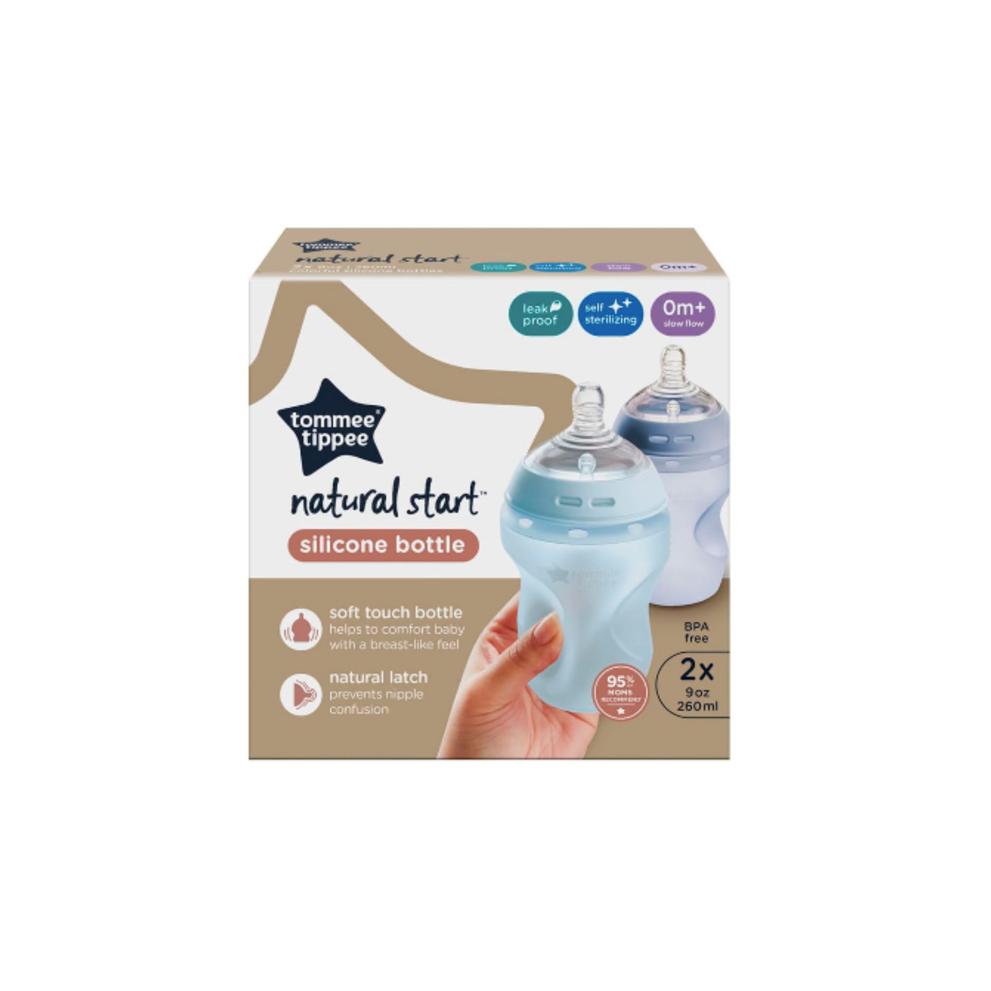 Biberón de silicona de tacto suave, pezón de flujo lento, anti cólicos, resistente a las manchas y al olor (9 onzas, 2 unidades, azul)